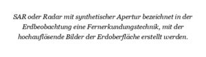 Beim synthetischen Radar (SAR) werden Mikrowellenimpulse von einer Radarantenne auf einer beweglichen Plattform wie einem Satelliten oder einem Flugzeug zur Erdoberfläche gesendet. Diese Impulse interagieren mit Objekten und Geländemerkmalen auf der Land- oder Wasseroberfläche. Die Radarantenne empfängt reflektierte Echos dieser Objekte. Der SAR misst die Verzögerung und Intensität dieser Echos, während sich die Plattform auf ihrem Weg bewegt. Durch die Verarbeitung dieser Echos mit präzisen Zeit- und Phaseninformationen erstellt SAR ein hochauflösendes Bild des Bereichs unterhalb der Flugbahn der Plattform. Aufgrund ihrer Fähigkeit, unabhängig von Wetterbedingungen und Lichtquellen zu arbeiten, wird diese Technologie häufig für die Umweltüberwachung, das Katastrophenmanagement und die militärische Aufklärung eingesetzt.