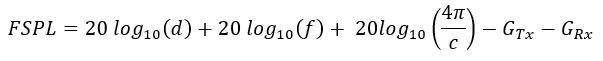 FSPL(dB) = 20 × log₁₀(d) + 20 × log₁₀(f) + 92,45 − GTx − GRx